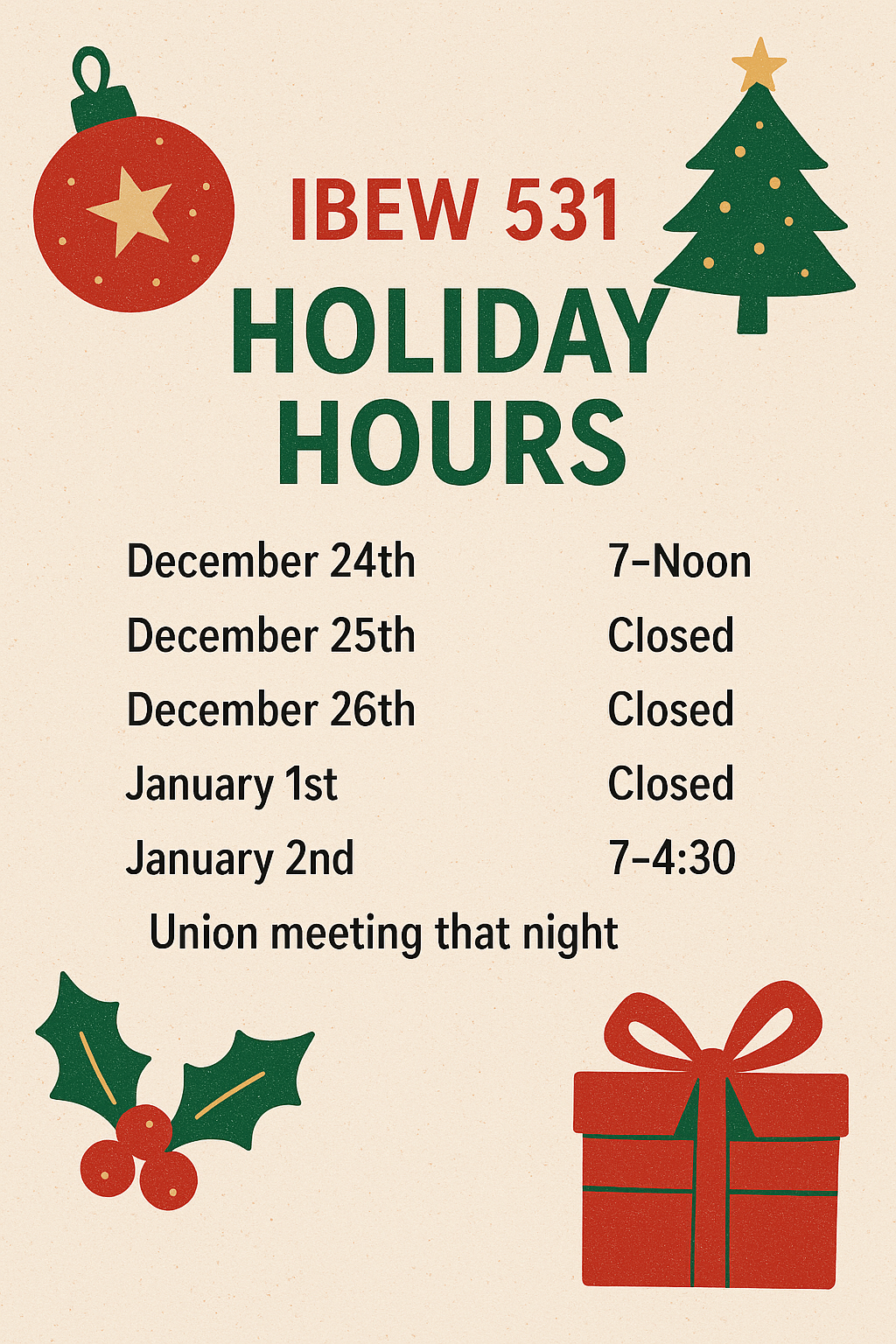 First, we have our awards banquet coming up at the Blue Chip Casino. This will be August 16th. Doors open at 5 pm, cocktail hour begins at 5:30 and dinner will be promptly at 7 pm. If you have not already, please RSVP that you will be coming. www.ibewlocal531.org/banquet2025